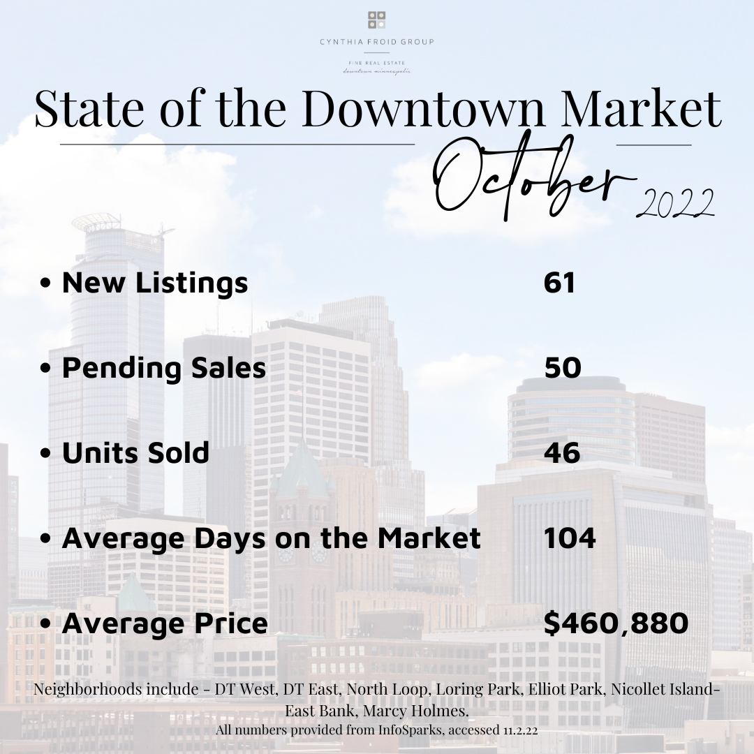 EACH MONTH, WE ASSESS THE STATE OF THE DOWNTOWN MINNEAPOLIS REAL ESTATE MARKET! THESE STATS INCLUDE A SPECIFIC AREA OF DOWNTOWN MINNEAPOLIS (DOWNTOWN EAST, DOWNTOWN WEST, NORTH LOOP, LORING PARK, ELLIOT PARK, NICOLLET ISLAND/EAST BANK, AND MARCY HOLMES). WE WOULD BE HAPPY TO PROVIDE A REPORT SPECIFICALLY FOR YOU! PLEASE CLICK THE LINK BELOW AND INCLUDE YOUR BUILDING AND CONTACT INFO TO REQUEST YOUR CUSTOMIZED REPORT.