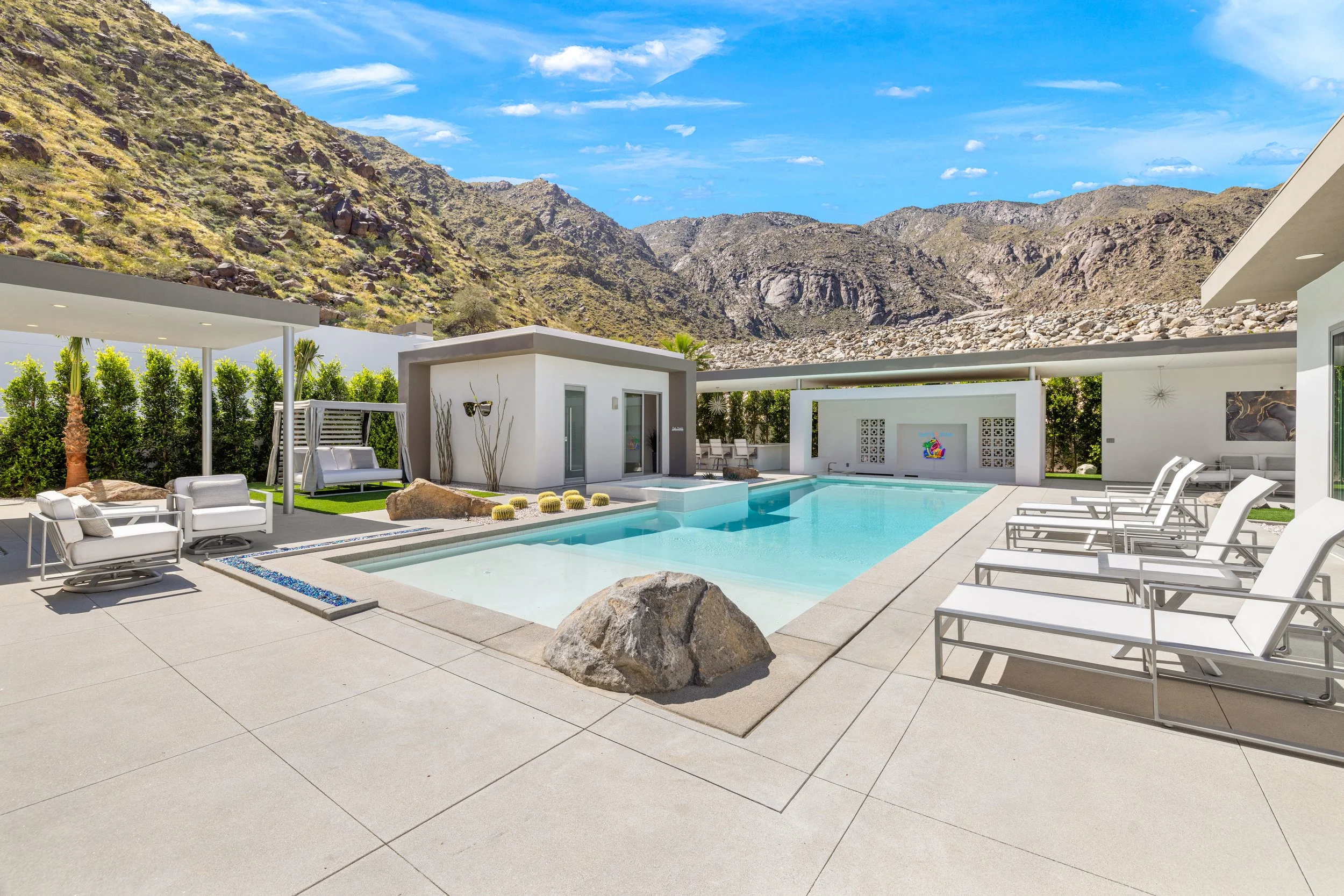 Set within the exclusive gated enclave of ONE Las Palmas in coveted Old Las Palmas, this architecturally striking modern compound captures dramatic, up-close views of the San Jacinto mountains and the iconic Dry Falls. This enhanced residence blends mid-century inspiration with contemporary execution, delivering privacy, scale, and a true resort-caliber lifestyle just moments from downtown Palm Springs. Completed and furnished in 2025 and lightly enjoyed as a private retreat, the home offers a rare sense of newness paired with thoughtful upgrades throughout. Walls of glass, soaring ceilings with clerestory windows, and expansive sliding doors create seamless indoor/outdoor living, filling the interiors with natural light while framing the surrounding landscape. Outdoor living is exceptional. A dramatic pool setting is anchored by an expansive cabana complete with lounge, swim-up bar, bath, BBQ island, and outdoor shower designed for entertaining at scale or relaxing in total privacy.