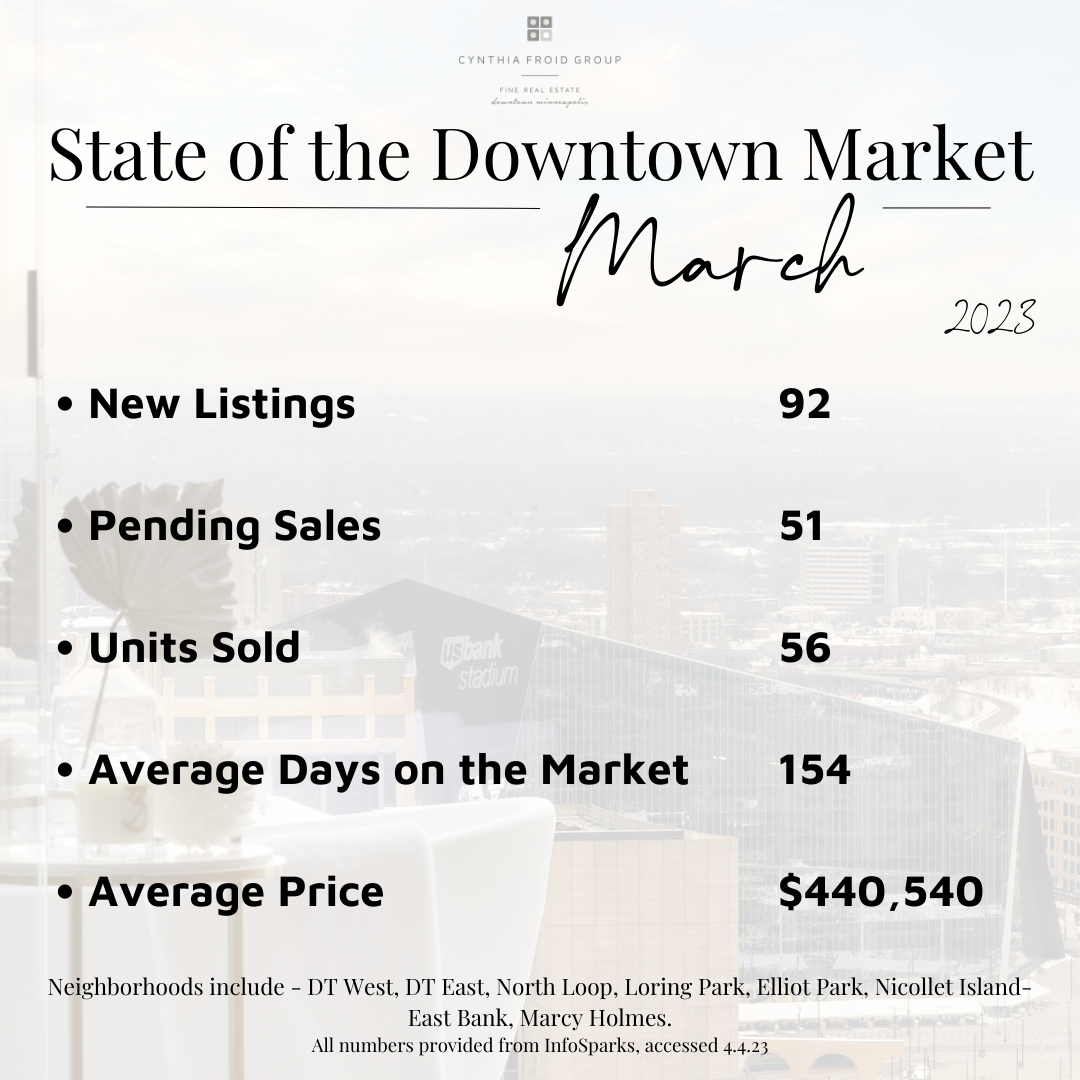 EACH MONTH, WE ASSESS THE STATE OF THE DOWNTOWN MINNEAPOLIS REAL ESTATE MARKET! THESE STATS INCLUDE A SPECIFIC AREA OF DOWNTOWN MINNEAPOLIS (DOWNTOWN EAST, DOWNTOWN WEST, NORTH LOOP, LORING PARK, ELLIOT PARK, NICOLLET ISLAND/EAST BANK, AND MARCY HOLMES). WE WOULD BE HAPPY TO PROVIDE A REPORT SPECIFICALLY FOR YOU! PLEASE CLICK THE LINK BELOW AND INCLUDE YOUR BUILDING AND CONTACT INFO TO REQUEST YOUR CUSTOMIZED REPORT.