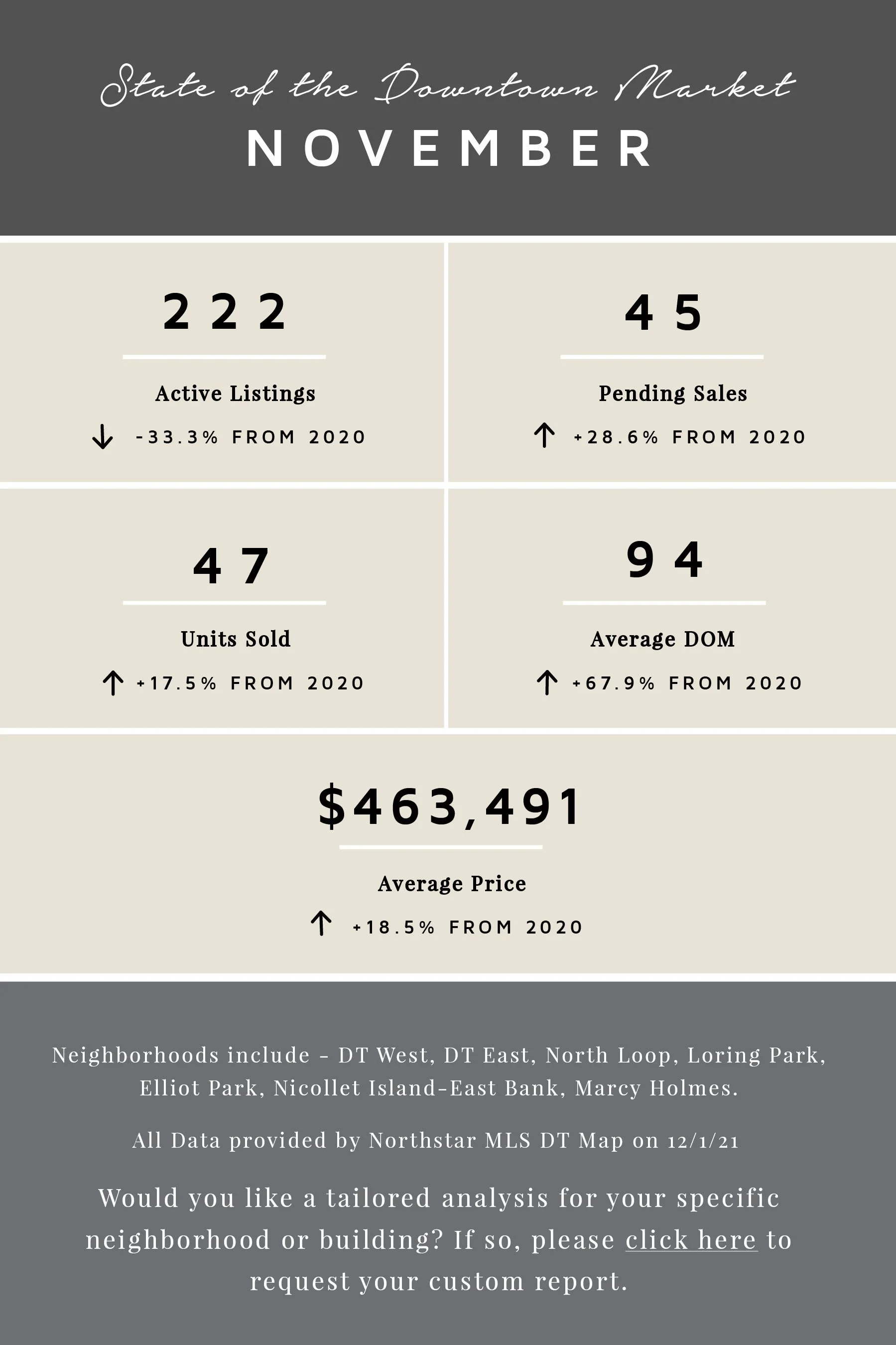 Each month, we assess the State of the Downtown Minneapolis Real Estate Market! These stats include a specific area of Downtown Minneapolis (Downtown East, Downtown West, North Loop, Loring Park, Elliot Park, Nicollet Island/East Bank, and Marcy Holmes). We would be happy to provide a report specifically for you! Please click the link below and include your building and contact info to request your customized report.