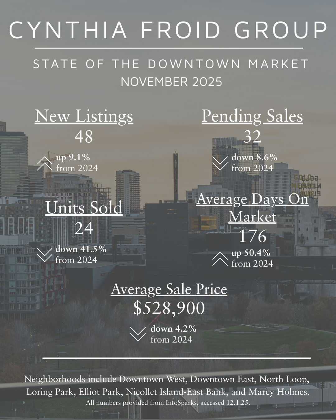 Each month, we assess the state of the Downtown Minneapolis real estate market. These statistics are from the following neighborhoods of Downtown Minneapolis- Downtown East, Downtown West, North Loop, Loring Park, Elliot Park, Nicollet Island/East Bank, and Marcy Holmes.