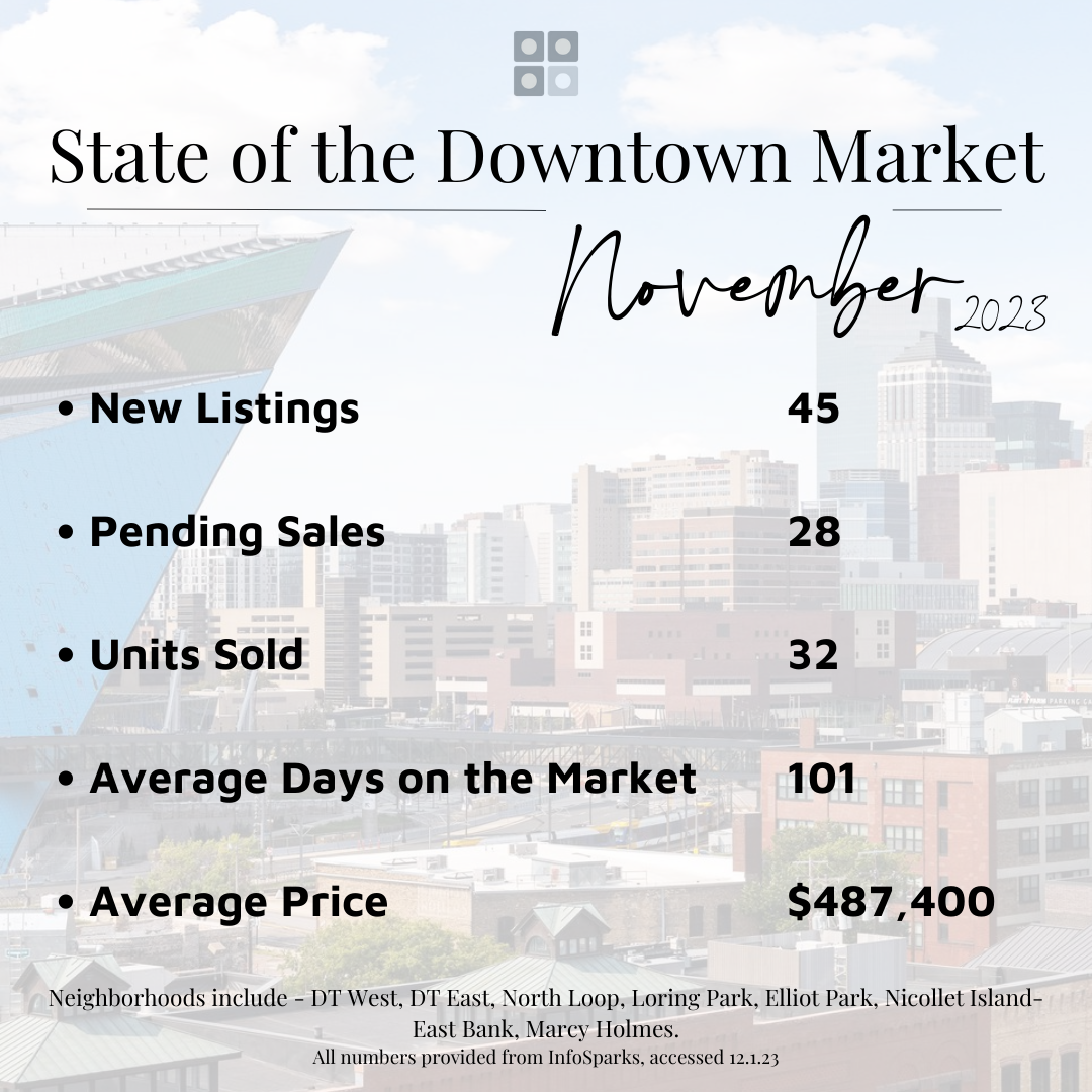 EACH MONTH, WE ASSESS THE STATE OF THE DOWNTOWN MINNEAPOLIS REAL ESTATE MARKET! THESE STATS INCLUDE A SPECIFIC AREA OF DOWNTOWN MINNEAPOLIS (DOWNTOWN EAST, DOWNTOWN WEST, NORTH LOOP, LORING PARK, ELLIOT PARK, NICOLLET ISLAND/EAST BANK, AND MARCY HOLMES). WE WOULD BE HAPPY TO PROVIDE A REPORT SPECIFICALLY FOR YOU! PLEASE CLICK THE LINK BELOW AND INCLUDE YOUR BUILDING AND CONTACT INFO TO REQUEST YOUR CUSTOMIZED REPORT.